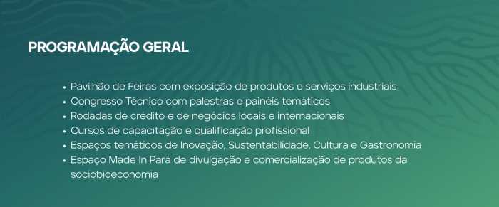 Eventos XVII Feira da Indústria do Pará 00 Detalhes do eventoHangar Centro de Convenções da Amazônia08:0020/05/202623/05/2026Carregando contador…A maior vitrine da indústria da Amazônia. A Fipa 2026 irá acontecer de 20 a 23 de maio de 2026, no Centro do Convenções e Feiras (Hangar), em Belém.